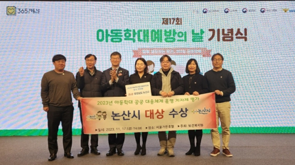 [충청뉴스 논산 = 조홍기 기자] 논산시(시장 백성현)가 보건복지부 주관 ‘2023년 아동학대 공공 대응체계 운영 평가’에서 229개 기초지방자치단체 중 가장 높은 평가를 받고 영예의 대상을 수상했다.