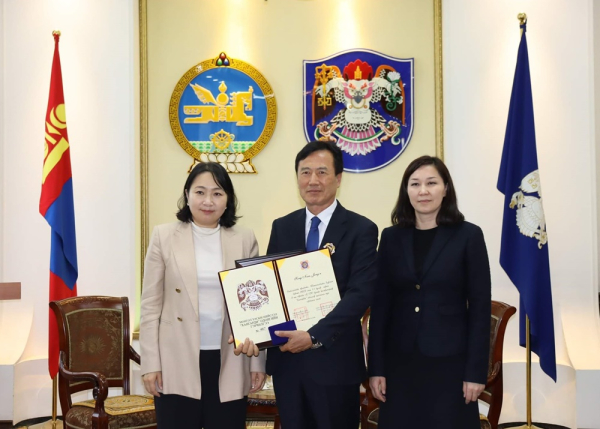 [충청뉴스 박동혁 기자] 남서울대학교는 객원교수인 송남종 ㈜금강CNT 대표가 최근 몽골 울란바토르 시청에서 몽골 정부 최고 훈장을 받았다고 26일 밝혔다.