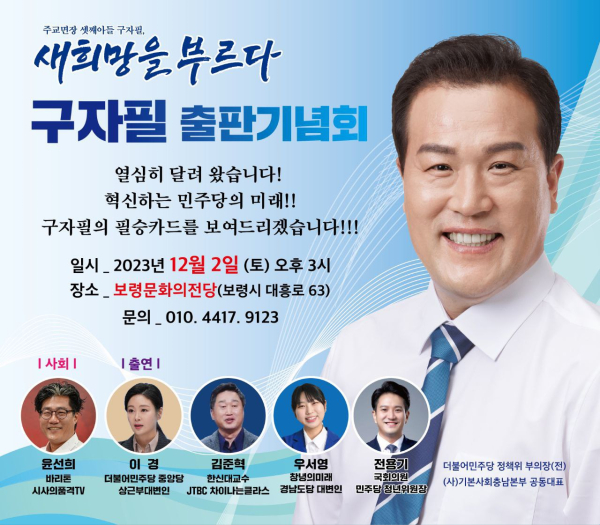 먼저 구자필 (사)기본사회충남본부 공동대표가 오는 12월 2일 보령문화의전당에서 출판기념회를 개최한다. 이날 행사에는 이경 민주당 부대변인이 지원 사격에 나선다.
