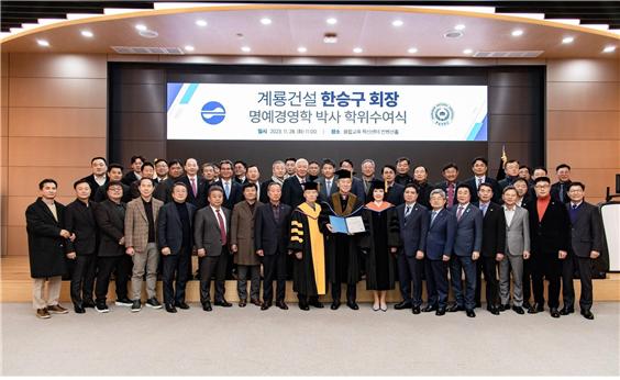 계룡건설 이승찬 회장은 축사를 통해 “명예 경영학박사 학위가 지난 34년간 회장님의 헌신과 공로에 대한 경의와 존경의 증표이자 헌사가 아닌가 생각한다”라며 한승구 회장의 또다른 도전을 응원했다.