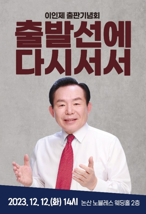 이 전 의원은 오는 12일 오후 2시, 논산 노블레스웨딩홀에서 '출발선에 다시서서'라는 제목의 책을 출판하고 기념회를 개최할 예정이다.