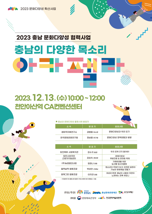 재단 관계자는 “이번 행사를 통해 충남의 문화다양성 확산과 인식 개선을 위해 다양한 의견을 공유하고, 충남의 문화다양성의 현재와 미래를 논의하는 장이 될 것”이라고 밝혔다.