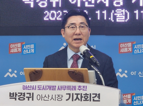 박경귀 시장은 11일 아산시청 중회의실에서 기자회견을 열고 "아산시에 도시개발 사무 특례가 부여된다면 충청권 전역으로 생활, 교통, 주거, 의료 등의 인프라를 빠르게 공급할 수 있는 국토 균형발전의 큰 기회가 될 것"이라고 주장했다.