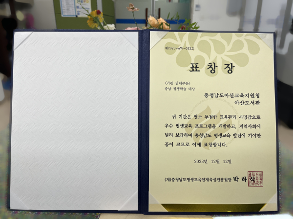 [충청뉴스 박동혁 기자] 충청남도아산교육지원청아산도서관은 ‘2023년 제5회 충남 평생학습 대상’ 시상식에서 기관·단체부문 중 진흥원장상을 받았다고 13일 밝혔다.