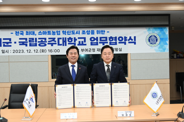 [충청뉴스 부여 = 조홍기 기자] 부여군(군수 박정현)은 농업 인구감소, 고령화 및 지역소멸 가속화에 따른 농업환경 변화에 선제 대응하고자 지난 12일 국립공주대학교와 업무협약(MOU)을 체결했다.