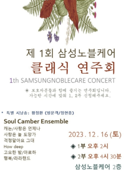 송은주 원장은 "제1회 삼성노블케어 클래식 연주회는 1부 오후 2시, 2부 오후 4시 30분 등 2회, 80여 분의 어르신들과 보호자들에게 쉼과 힐링의 시간을 제공하기 위해 마련됐다"고 밝혔다.