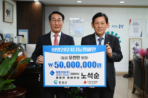 [충청뉴스 권상재 기자] 홍동면 출신인 노석순(원영건업 대표이사) 홍동면 명예면장이 지난 18일 홍성군청을 방문해 고향사랑 실천으로 5,000만 원의 이웃사랑 성금을 기탁해 지역사회에 귀감이 되고 있다.