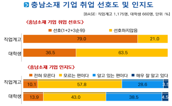 조사결과로 충남소재 기업 취업 선호도에서는 직업계고생의 경우 79.0%, 대학생 36.5%가 충남소재 기업에 취업하고 싶은 것으로 집계됐다.