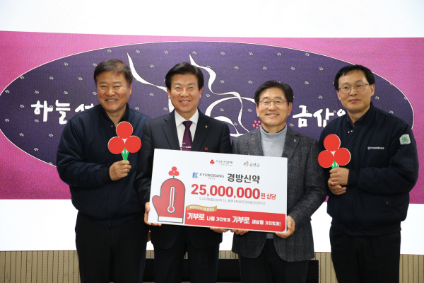 [충청뉴스 금산 = 조홍기 기자] 경방신약 주식회사(대표 김충환)는 지난 26일 금산군청을 찾아 연말연시 어려운 이웃을 돕기 위해 희망2024 나눔캠페인에 참여하며 건강보조식품 2500만 원 상당 650박스를 기탁했다. 전달 제품은 도라지배즙 및 활력MSM프리미엄 등이다.