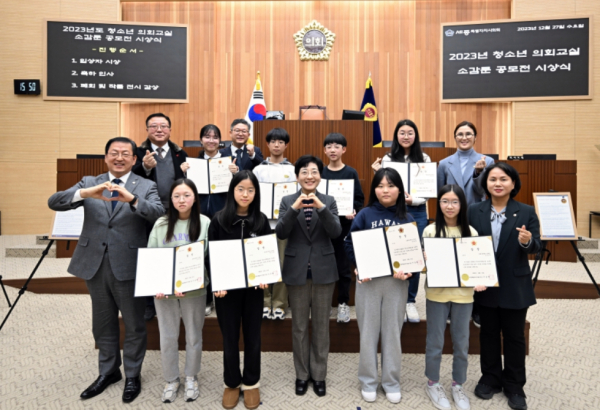 [충청뉴스 최형순 기자] 세종특별자치시의회(의장 이순열)는 27일 본회의장에서 ‘2023년 청소년 의회교실 소감문 공모전’ 시상식을 개최하고 우수작으로 뽑힌 8명에게 상장을 수여했다.