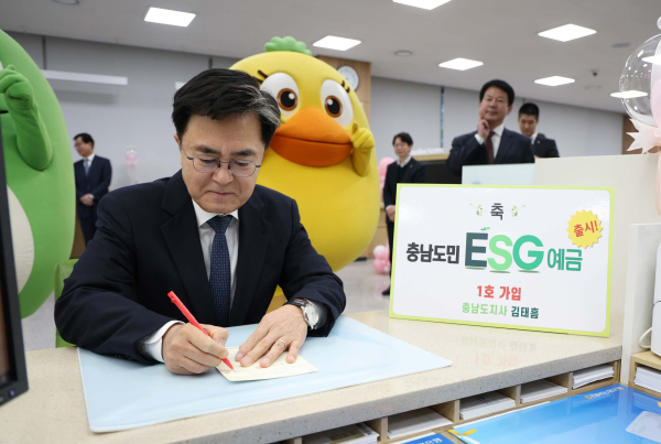 도에 따르면, 김 지사는 2일 내포신도시에 있는 NH농협은행 충남영업부를 방문해 NH농협은행 충남본부가 새해부터 출시한 ‘충남도민숲 ESG 예금’에 1호로 가입했다.