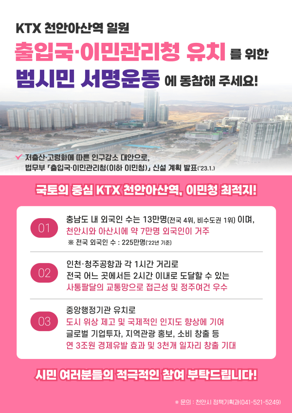 [충청뉴스 박동혁 기자] 충남 천안시는 출입국·이민관리청을 KTX 천안아산역 일원에 유치하기 위한 범시민 서명운동을 벌인다고 4일 밝혔다.