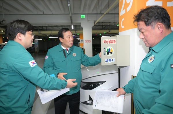 최민호 시장은 시청 지하 민방위 비상 대피시설을 점검한 후 대피시설로 지정된 보람동 호려울마을 5단지 아파트 지하 주차장으로 이동, 대피시설 내 비상용품을 점검했다.
