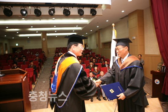 이날 수료식은 이원묵 총장의 축사를 시작으로 53명의 본 과정 수료자에게 수료증 수여, 공로자에 대한 상패수여 순으로 진행외었다. 특히, 24기생(원우회장 서정우)들이 모은 발전기금 1천만 원을 대학에 전달했다.