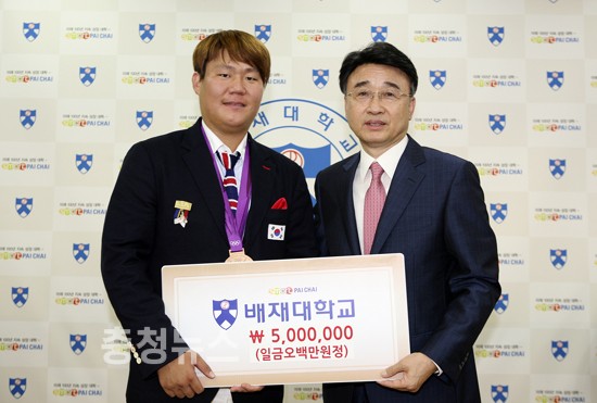 2012 런던올림픽 남자양궁 단체전 동메달리스트인 김법민 선수가 23일 모교인 배재대학교 김영호 총장으로부터 격려금 5백만원을 받고 4년 뒤 금메달 사냥을 약속했다.