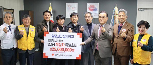 천안시 직산읍의 양당첨단산업단지 입주기업들이 천안시청에서 대한적십자사 충남지사에 2024년 적십자 특별회비 2,500만 원을 전달했다