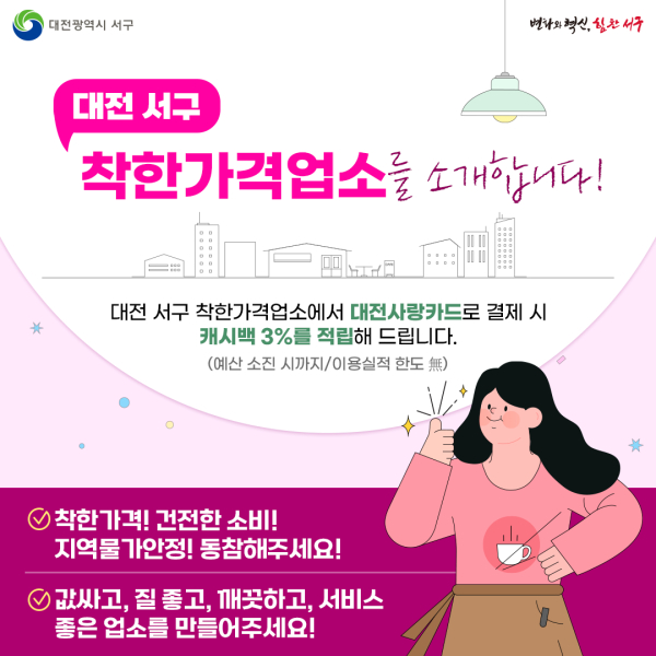 [충청뉴스 박영환 기자] 대전 서구(구청장 서철모)는 오는 22일부터 관내 착한가격업소에서 대전사랑카드 가맹업소를 이용한 고객에게 사용 금액의 3% 캐시백을 예산 소진 시까지 지급한다고 19일 밝혔다.