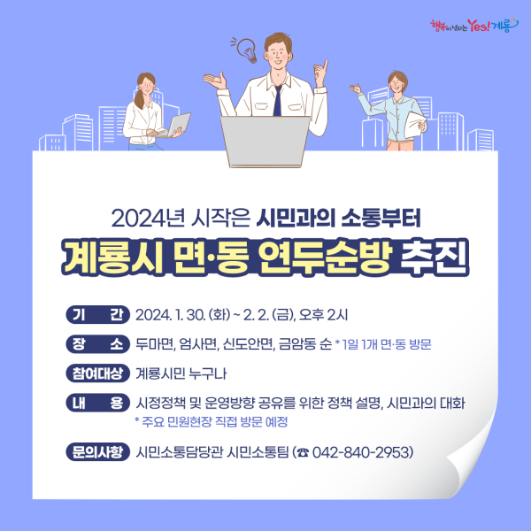 이응우 시장은 “시정 슬로건인 ‘행복이 넘치는 Yes! 계룡’ 완성을 위해서는 시민의 목소리를 경청하고 시정에 반영하는 것이 무엇보다 중요하다”며, “계룡시 발전을 위한 다양한 의견이 제안될 수 있도록 오는 30일부터 시작하는 2024년도 면‧동 연두순방에 시민 여러분의 많은 참여를 바란다”고 말했다.