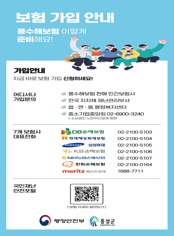 풍수해보험 가입은 읍‧면 행정복지센터 및 DB손해보험, 현대해상화재보험, 삼성화재해상보험, KB손해보험, 한화손해보험, NH농협손해보험, 메리츠화재보험 등 7개 보험사에서 연중 가입이 가능하다.