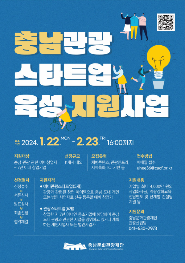 [충청뉴스 권상재 기자] 충남문화관광재단(대표이사 서흥식)이‘2024 충남관광 스타트업 육성지원사업’에 참여할 관광 분야 예비창업자 및 스타트업을 모집한다고 24일 밝혔다.