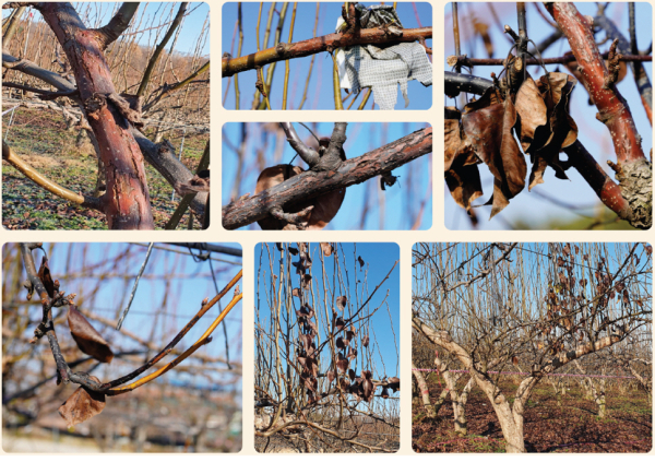 겨울철 사과·배 과원에서 관찰할 수 있는 궤양 증상으로는 ▲수피가 갈라지거나 터지는 형태 ▲진갈색이나 검게 변하고 마르는 형태 ▲수피가 들어가면서 경계가 생기는 형태 등이 있다.
