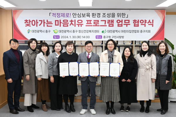 [충청뉴스 박영환 기자] 대전 중구(구청장 권한대행 이동한)는 대전 중구 정신건강복지센터(센터장 조선미), 대전시 어린이집연합회 중구지회(회장 홍미영)와 함께 어린이집 보육 교직원의 마음건강 증진을 위한 '찾아가는 마음치유 프로그램'운영 업무 협약을 맺었다고 31일 밝혔다.