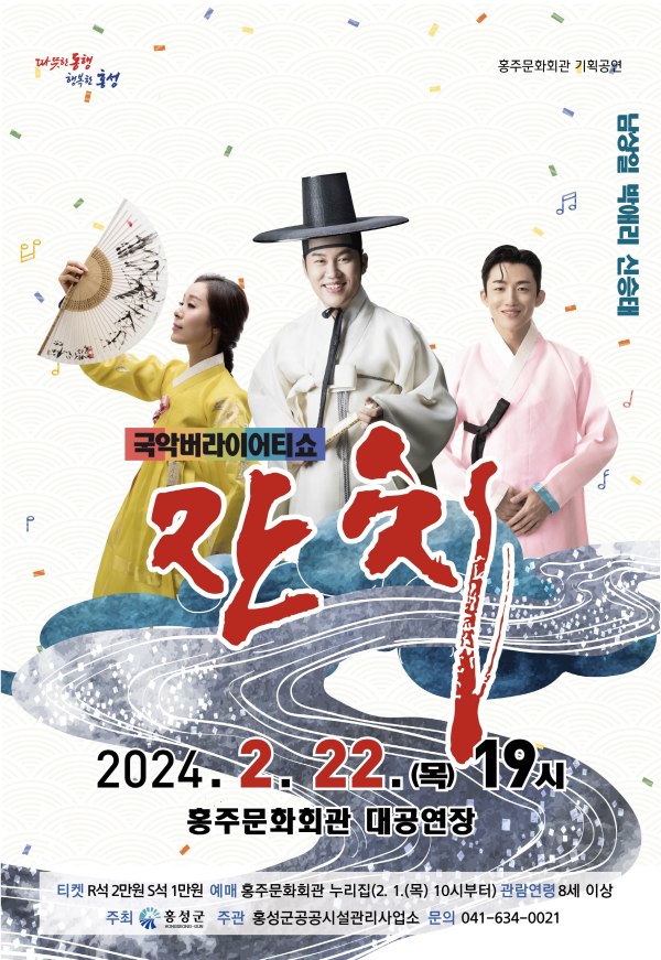 [충청뉴스 권상재 기자] 홍성군 홍주문화회관은 갑진년을 맞아 홍성군민의 행운을 기원하는 국악버라이어티쇼 ‘잔치’를 오는 22일 오후 7시 대공연장 무대에 올린다.