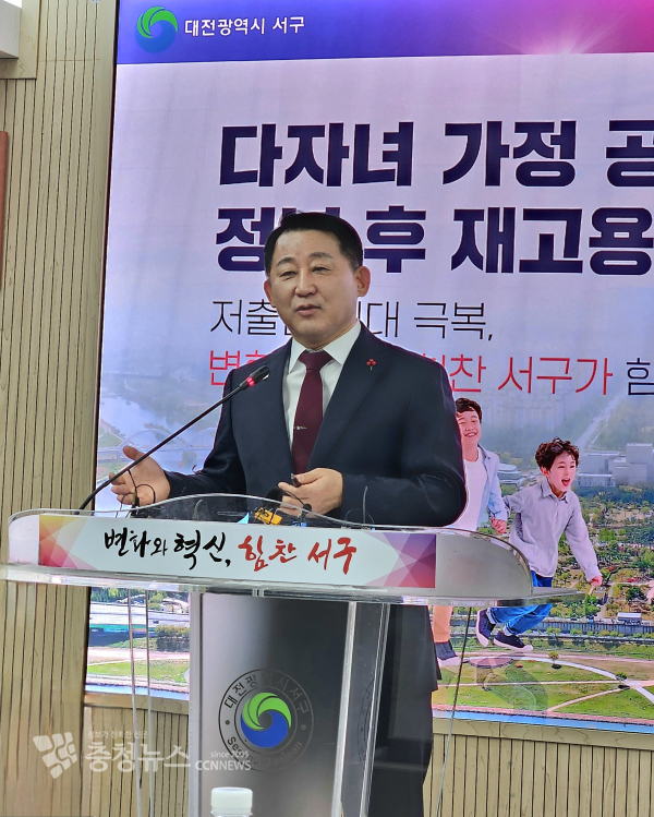 [충청뉴스 박영환 기자] 서철모 대전 서구청장이 저출산 극복 대응을 위해 5일 오전 서구청 장태산실에서 전국 최초로 ‘다자녀 가정 공무직 정년 후 재고용 방안’에 대해 발표했다.