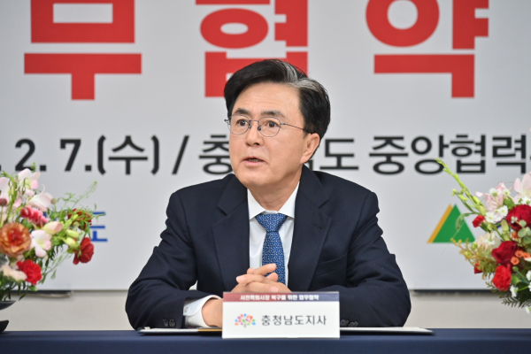 김태흠 지사는 7일 서울 도 중앙협력본부 브리핑실에서 윤영준 현대건설 대표이사, 김기웅 서천군수 등과 서천특화시장 복구를 위한 업무협약을 체결했다.