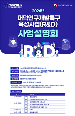 이번 사업설명회는 대덕연구개발특구육성사업 시행계획 공고에 따른 2024년도 대덕특구 사업 추진방향, 글로벌 진출 지원사업, 신기술 실증특례 사업 및 제도, 대덕특구 입주신청 및 절차 등을 소개할 예정이다.