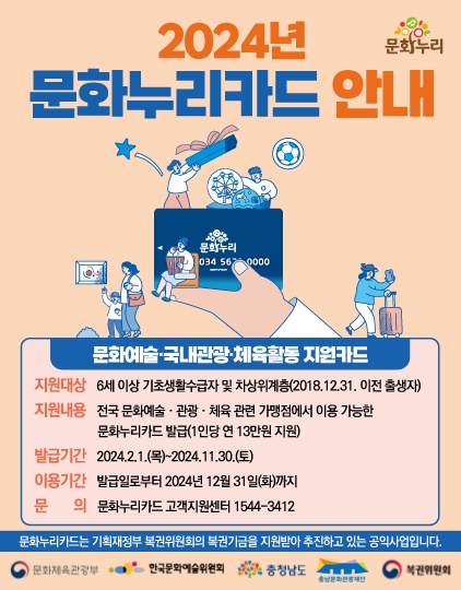 2024년도 문화누리카드는 대상자에 한해 연간 지원금 13만 원 사용 가능하고, 각 읍·면·동 행정복지센터, 문화누리카드 인터넷 누리집, 모바일 앱 등을 통해 오는 11월 30일까지 발급이 가능하며, 사용은 12월 31일까지 가능하다.