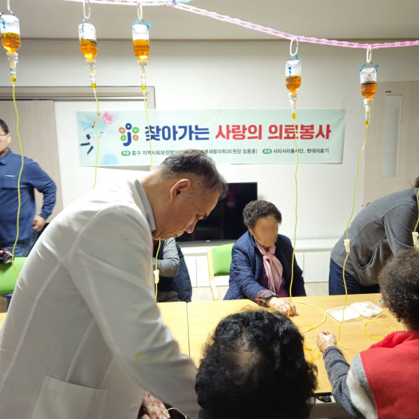 이날 의료봉사는 대흥동 지역사회보장협의체 임종훈 위원장(계룡재활의학과 원장)을 비롯한 중구 지역사회보장협의체 위원들과 간호사들이 경로당을 방문해 건강취약계층 어르신 25명에게 면역력강화와 건강관리를 위한 영양수액을 놓아드리고 건강상담 서비스를 진행했다.