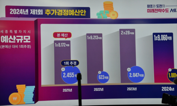 [충청뉴스 최형순 기자] 최민호 세종시장은 26일 브리핑을 통해‘24년 제1회 추경안 전체규모는 1,001억 원(일반회계 780억원, 특별회계 221억원)이라고 밝혔다.