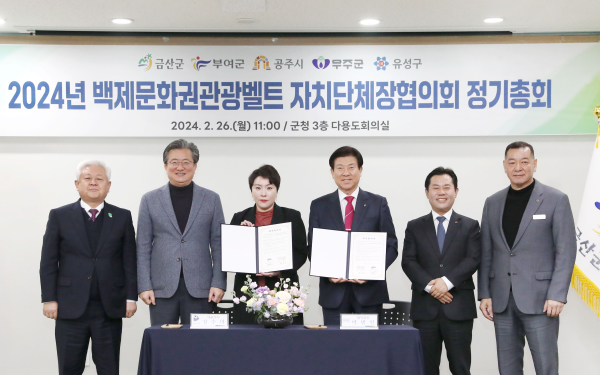 [충청뉴스 박영환 기자] 대전 유성구(구청장 정용래)가 26일 금산군청 회의실에서 5개 시군구 단체장 및 대전 엑스포 아쿠아리움 정수미 대표 등 관계자 6명이 참석한 가운데, 백제문화권관광벨트협의회와 지역간 상생과 관광산업 활성화를 위한 대전엑스포아쿠아리움 제휴 할인 업무 협약을 체결하고 있다.