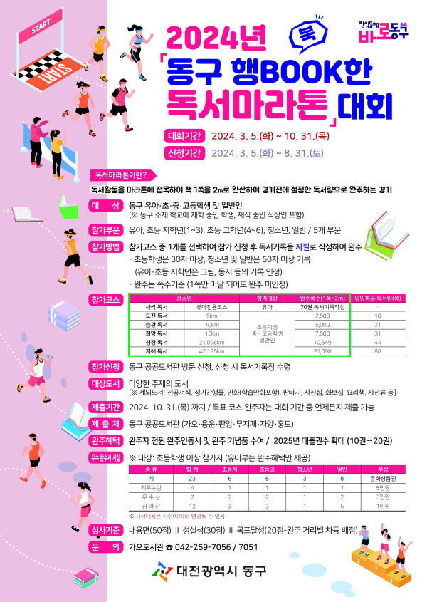 [충청뉴스 박영환 기자] 대전 동구(구청장 박희조)는 구민의 독서 생활화 및 책 읽는 환경 조성을 위해 ‘2024년 동구 행BOOK한 독서마라톤대회’를 개최한다고 28일 밝혔다.