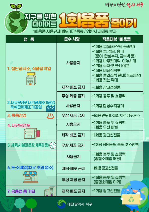 [충청뉴스 박영환 기자] 대전 서구(구청장 서철모)는 일회용품 사용규제 계도기간이 종료됨에 따라 변경된 일회용품 사용규제에 대해 안내한다고 29일 밝혔다.