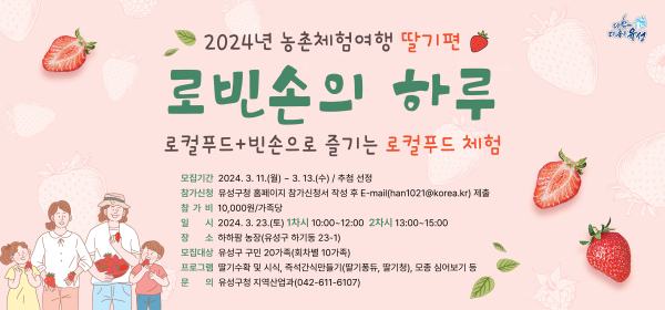 [충청뉴스 박영환 기자] 대전 유성구(구청장 정용래)가 오는 3월 11일부터 13일까지 가족이 함께 즐기는 로컬푸드 농촌체험‘로빈손의 하루’참여자를 모집한다.