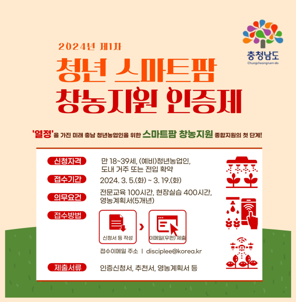 ‘충남형 청년 스마트팜 창농 지원 인증제’는 역량을 갖춘 청년 농업인 유입 및 정착 확대를 위해 스마트팜 경영 능력 등을 사전 검증하는 제도로 올해 처음 시행한다.