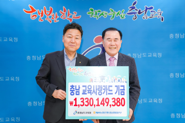 [충청뉴스 권상재 기자] 충남교육청은 8일 NH농협은행 충남본부로부터 지난해 충남교육사랑카드 사용으로 조성된 기금 13억 3,014만 원(전년도 12억 2,694만 원)을 전달받았다.