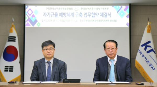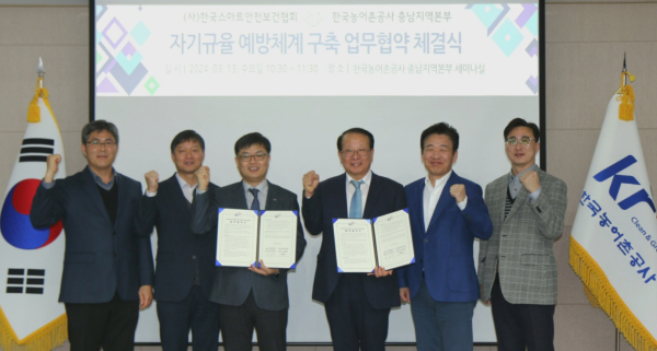 [충청뉴스 최형순 기자] 한국농어촌공사 충남지역본부(본부장 이민수)는 13일 (사)한국스마트안전보건협회 (회장 유현성, 이하 협회)와 건설 현장에서 자기규율예방체계 확립을 위한 ‘안전함’앱 개발 및 고도화를 진행하면서 50인 미만 사업장(50억 원 미만 공사)에 무료로 제공할 예정이다.
