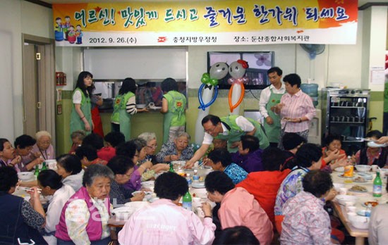 충청지방우정청(청장 이재홍)은 26일 오전 10시부터 오후 2시까지 둔산종합사회복지관에서 한가위 맞이‘어르신 무료급식 행사’를 개최했다고 밝혔다.