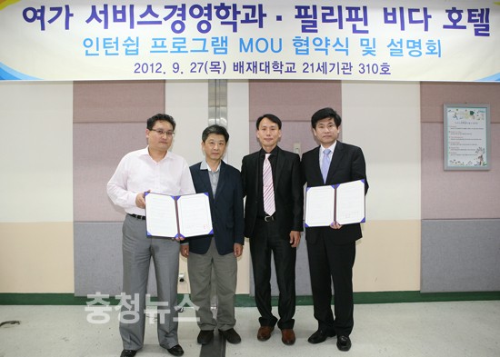 ▲ 배재대-필리핀 리조트 현장실습 협약 배재대학교 여가서비스경영학과(학과장 서진욱)와 이외 관계자들은 27일 대학 세미나실에서 필리핀 위더스 리조트(Widus Resort 대표이사 한대식)는 해외 현장실습 파견 협약식을 가졌다. 저작권자 © 충청뉴스 무단전재 및 재배포 금지 문요나 기자 다른기사 보기 기사가 마음에 드셨나요? 충청뉴스 좋은 기사 후원하기 1,000원 3,000원 5,000원 10,000원 30,000원 50,000원 직접입력 비회원 약관동의하기 ※ 소중한 후원금은 더 좋은 기사를 만드는데 쓰겠습니다.
