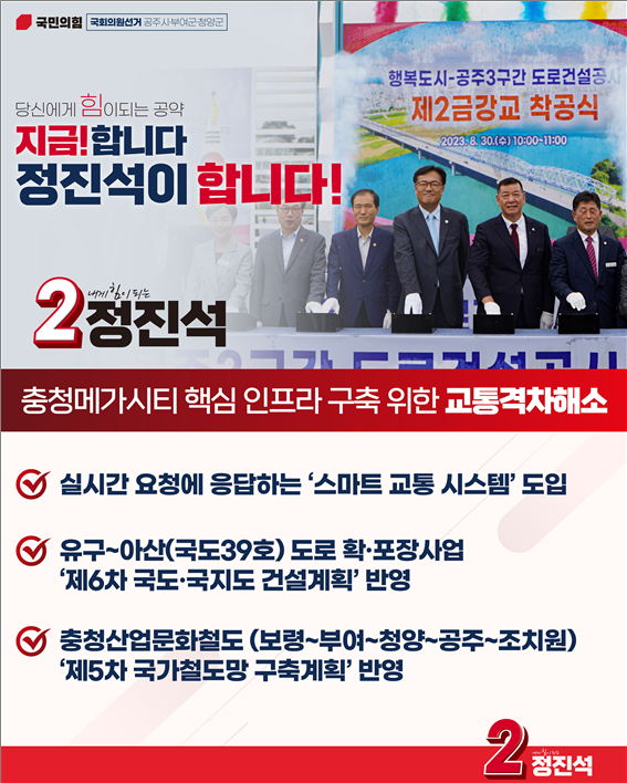 또한 정진석 후보는 “제2경부고속도로와 함께 제2서해안고속도로 사업이 올해 말 완공된다”라며 “수도권을 떠받치고 있는 아산과 공주를 연결하는 국도39호선 도로 확포장 사업, 충청산업문화철도 건설 추진을 통해 수도권과 지방 간 교통 격차를 해소하겠다”라고 말했다.