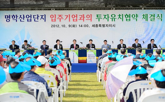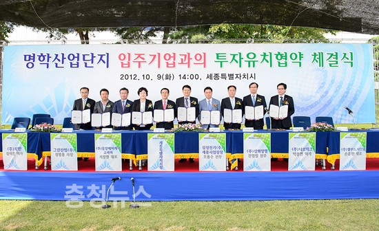 세종시는 9일 삼성전기㈜ 운동장에서 명학산업단지 입주예정기업 9개사와 총 1812억원 이상의 투자유치 협약식을 체결했다.