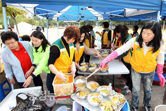 대전 유성구 전민동 자원봉사회(회장 전금숙)가 떡, 과일 등을 지역 주민으로부터 후원 받아 10일 오후 엑스포근린공원에서 200여 명의 지역 어르신을 모시고 오찬을 제공하는 국수나눔 봉사활동을 개최했다.