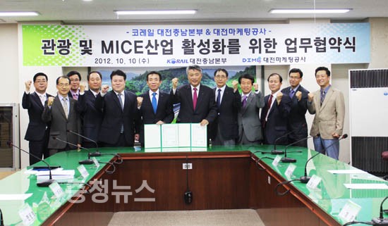 대전마케팅공사와 코레일 대전충남본부 양 기관은 ‘관광 및 MICE 산업 활성화를 위한 업무협약’을 10일 오후 2시, 코레일 대전충남본부에서 체결했다.