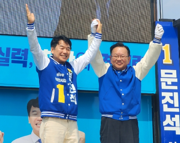 김부겸 위원장은 이날 천안시 원성동에서 진행된 문진석 후보 유세장을 찾아 “쌈박질하는 정치가 아닌, 뭔가 일을 해내는 정치 선봉장이 될 문진석 후보를 도와달라”고 밝혔다.