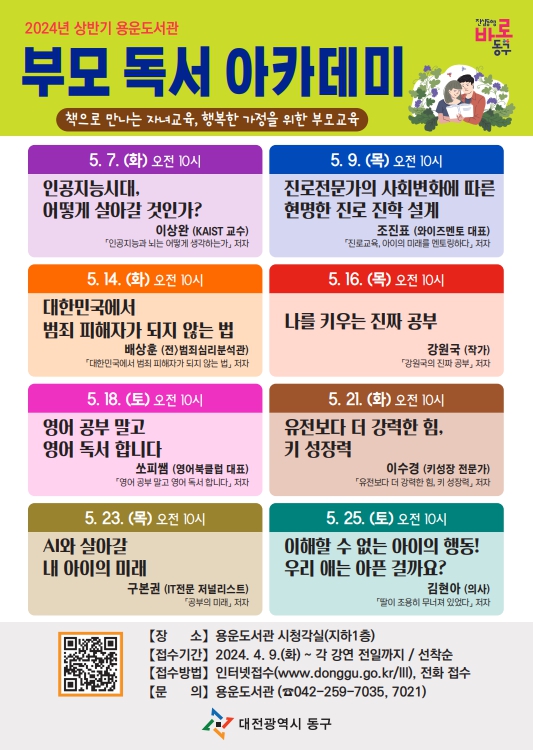 [충청뉴스 박영환 기자] 대전 동구(구청장 박희조)는 부모 교육 전문 강사를 초청해 5월 한 달간 총 8회에 걸쳐 ‘2024년 상반기 부모 독서 아카데미’를 개최한다고 8일 밝혔다.