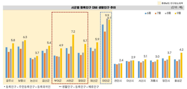 태안군의 경우 등록인구 대비 생활인구는 9.7배(등록인구 6만 2775명, 생활인구 61만 877명)로 집계돼 보령시 6.3배(등록인구 9만 9847명, 생활인구 63만 715명), 공주시 5.8배(등록인구 10만 4727명, 생활인구 60만 5815명)에 비해 생활인구 의존성이 더 높은 특징을 보였다.