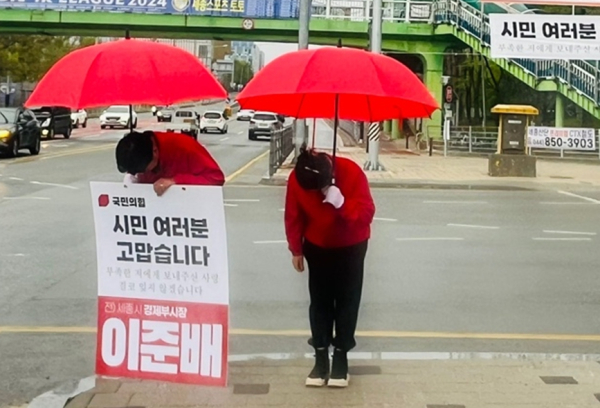[충청뉴스 최형순 기자] 제22대 국회의원 선거 패배한 국민의 힘 세종 갑 '류제화', 세종 을 '이준배' 후보가 15일 고마운 단비를 맞으며 시작하여, 앞으로 5일간 낙선인사를 실시할 계획이어서 잔잔한 감동을 주고있다.